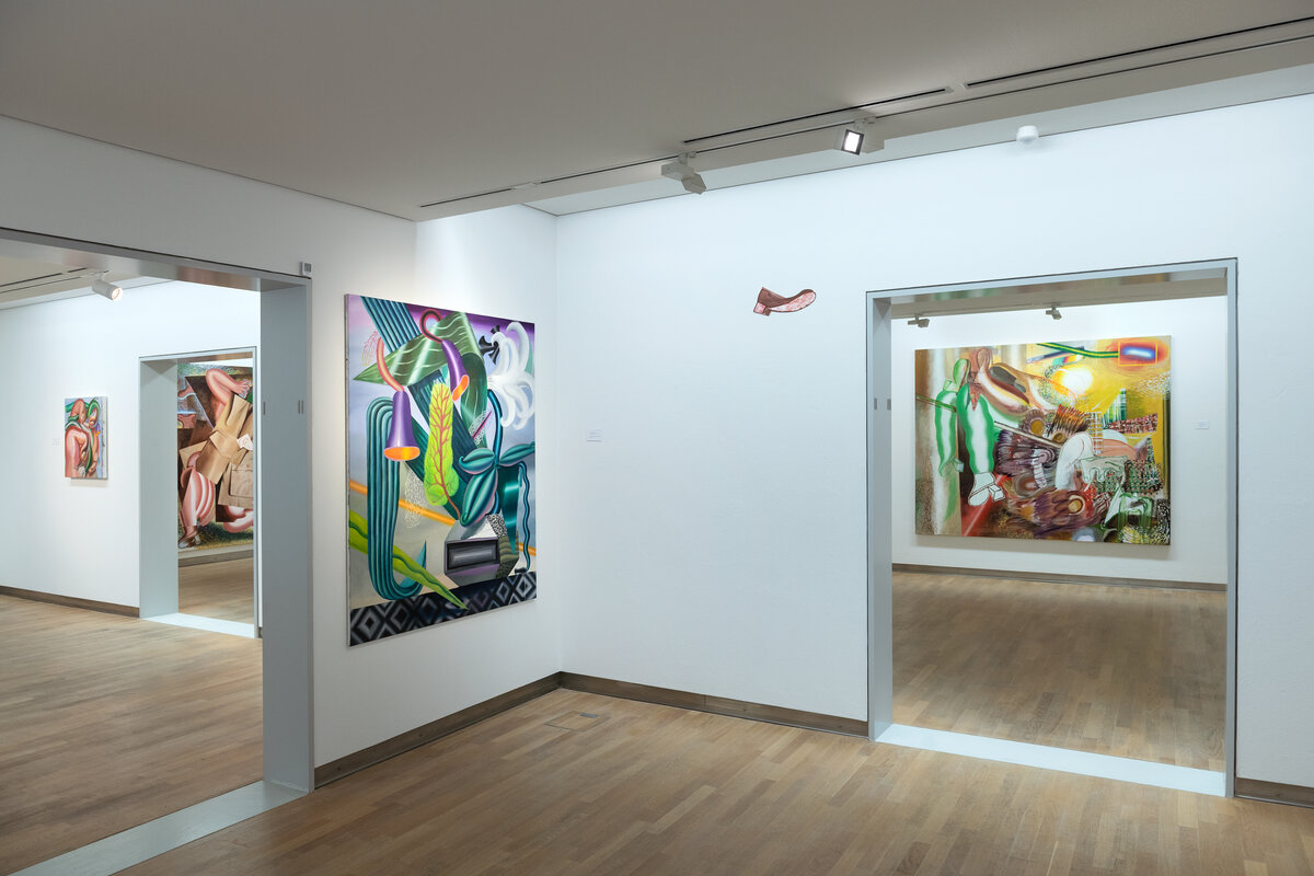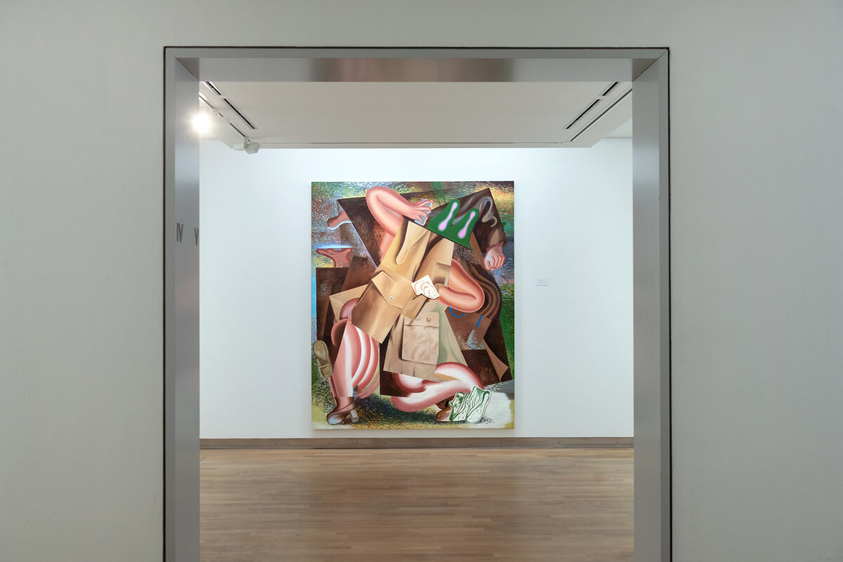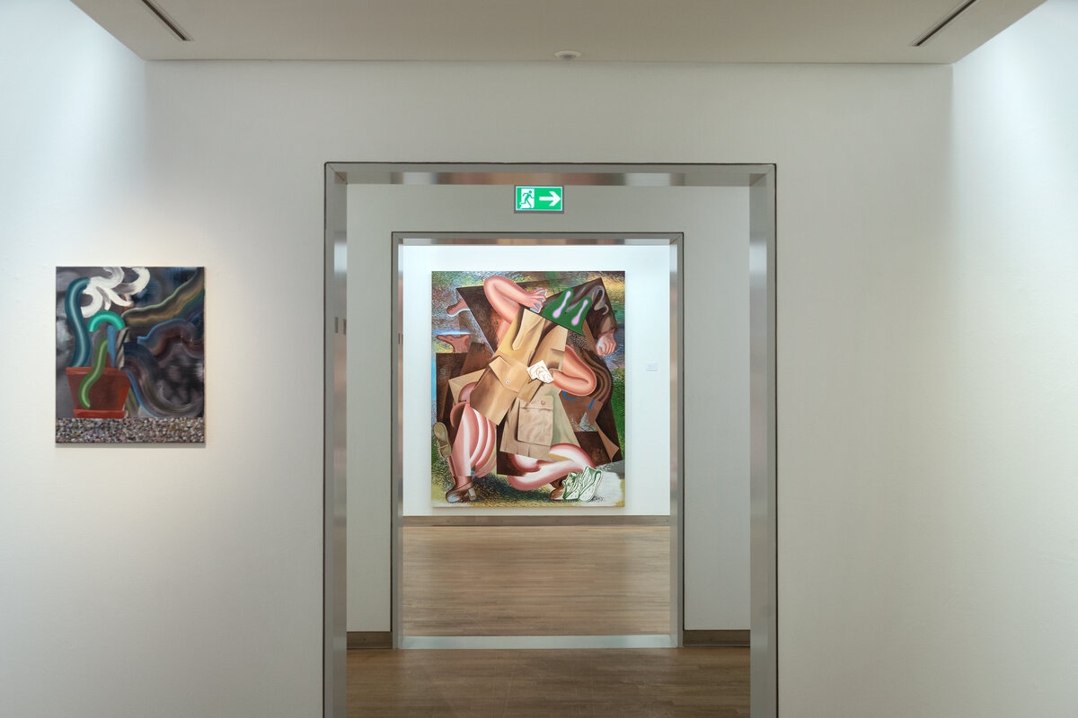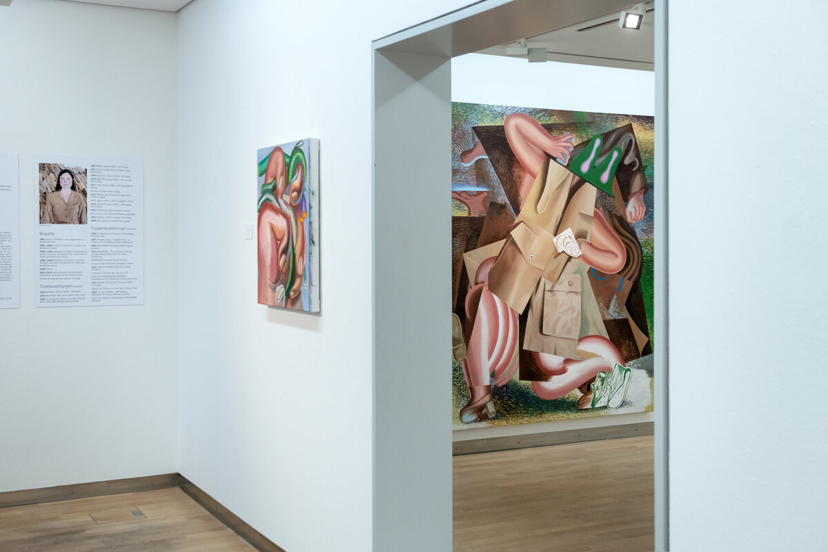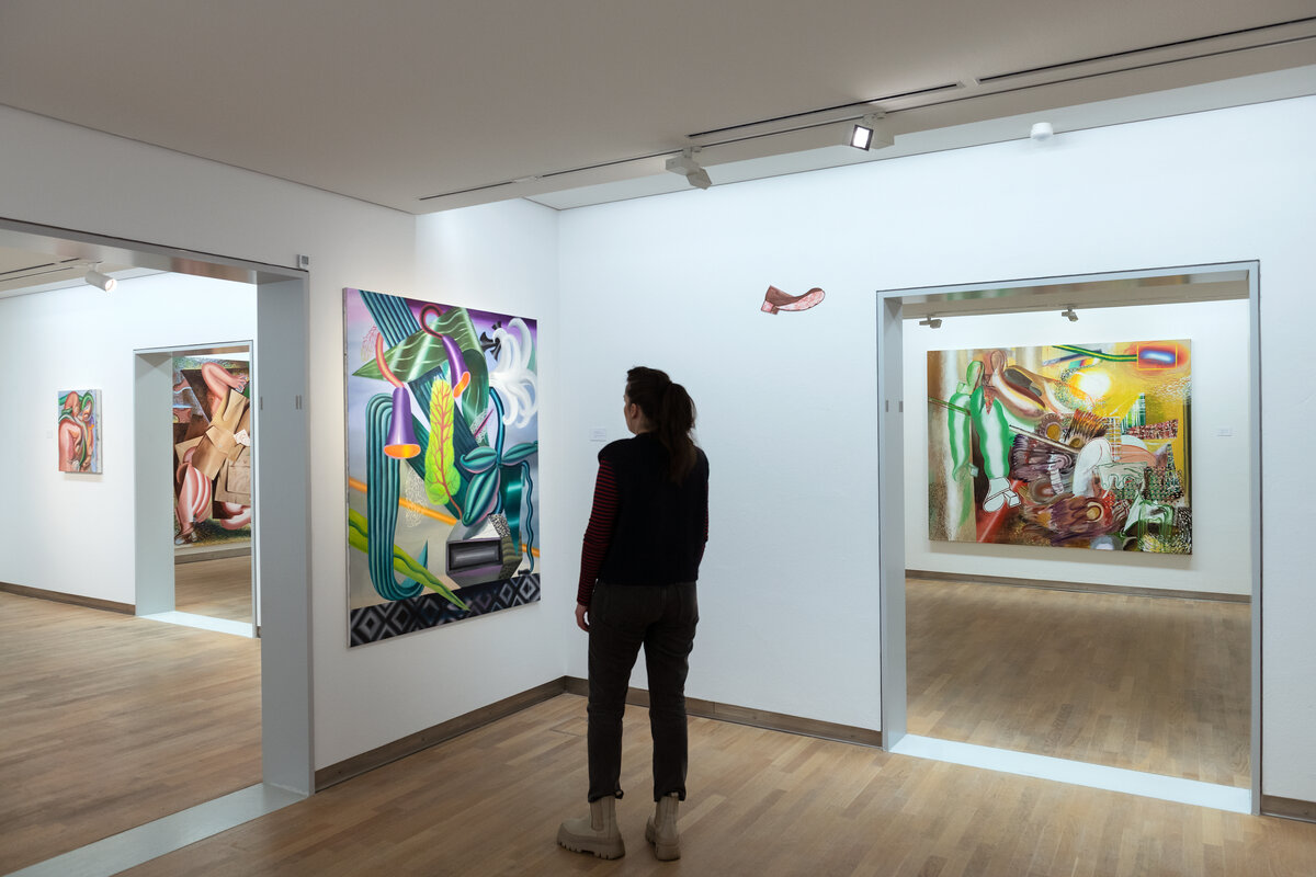 In den farbintensiven Bildern von Kristina Schuldt verschmelzen kunsthistorische und literarische Referenzen mit politischen, feministischen und persönlichen Themen zu rätselhaften, zugleich humorvollen Kompositionen. Ihre Bilder reflektieren die zerstreute Aufmerksamkeit unserer hochvernetzten Gegenwart und vermitteln den Menschen als eine im Bildraum gleichzeitig ein- wie auftauchende Gestalt. Nichts erscheint statisch oder abgeschlossen – eine explosive, dynamische Kraft durchdringt die zum Teil großformatigen Arbeiten und lässt sie nahezu übervoll wirken.