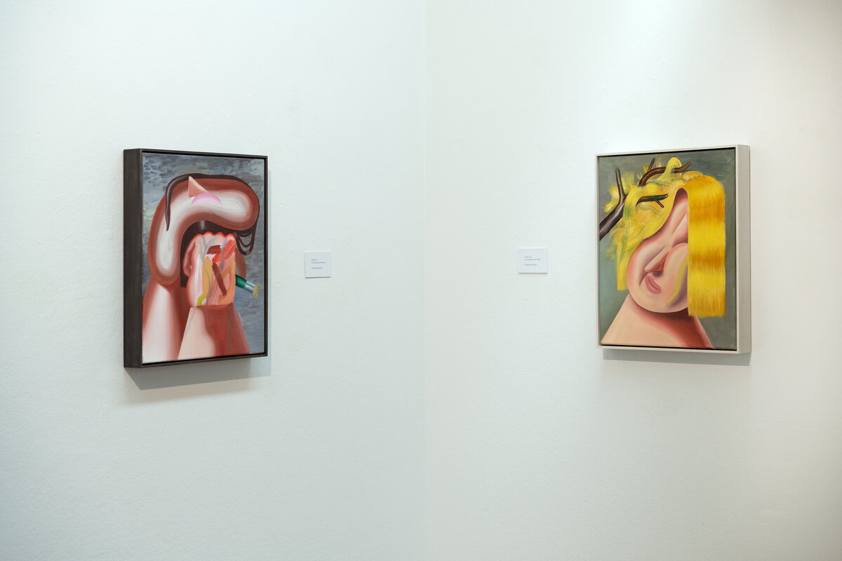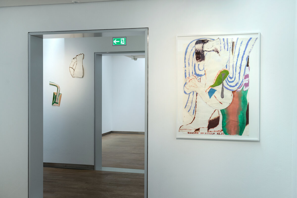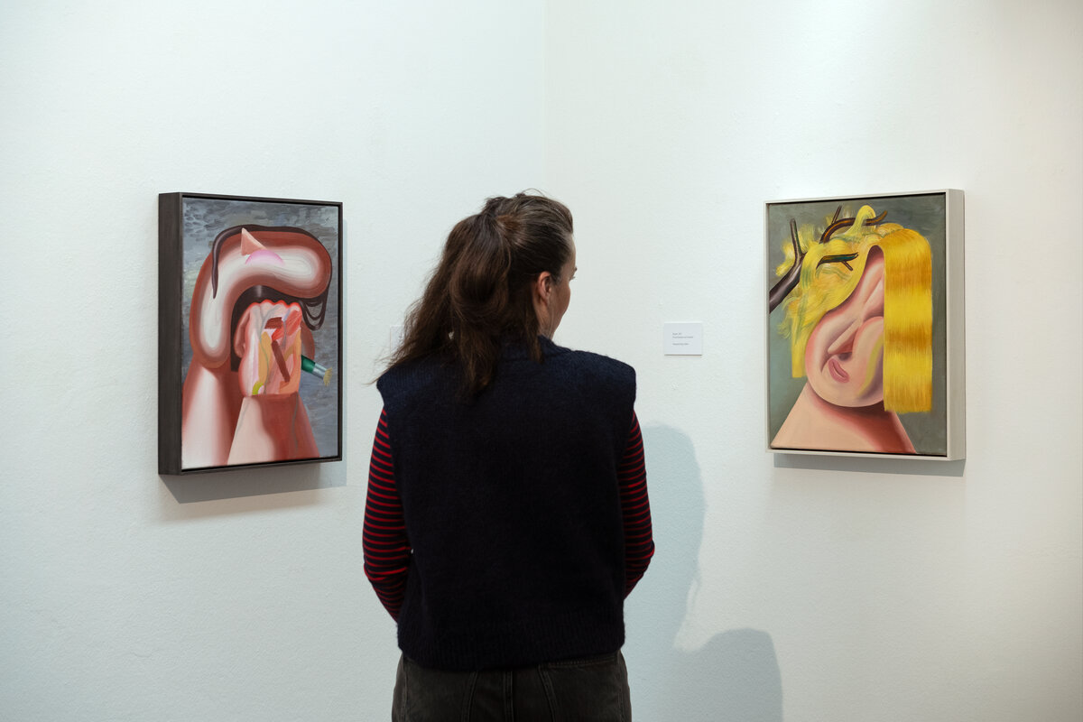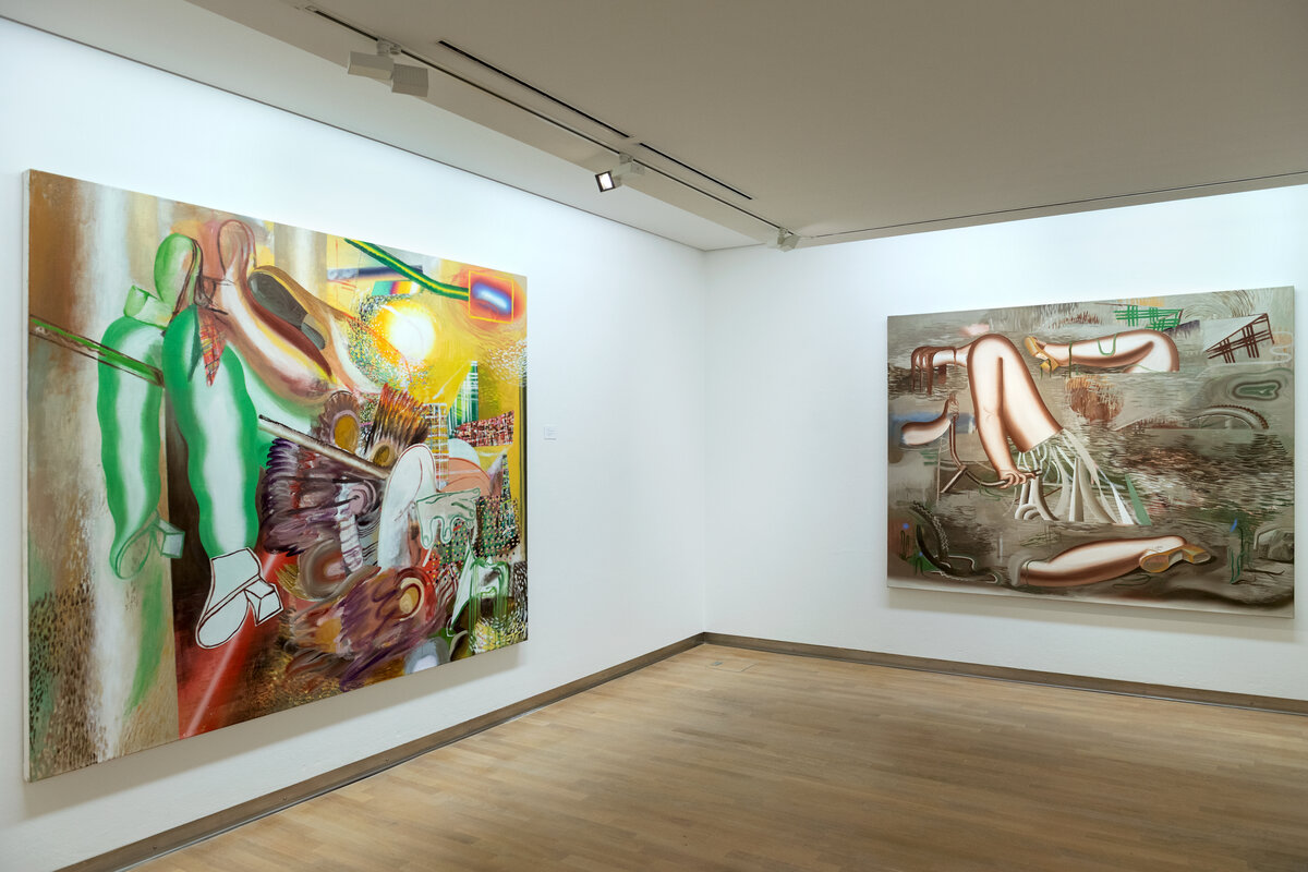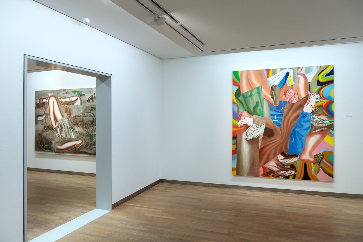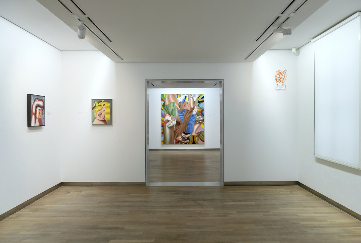 In den farbintensiven Bildern von Kristina Schuldt verschmelzen kunsthistorische und literarische Referenzen mit politischen, feministischen und persönlichen Themen zu rätselhaften, zugleich humorvollen Kompositionen. Ihre Bilder reflektieren die zerstreute Aufmerksamkeit unserer hochvernetzten Gegenwart und vermitteln den Menschen als eine im Bildraum gleichzeitig ein- wie auftauchende Gestalt. Nichts erscheint statisch oder abgeschlossen – eine explosive, dynamische Kraft durchdringt die zum Teil großformatigen Arbeiten und lässt sie nahezu übervoll wirken.
