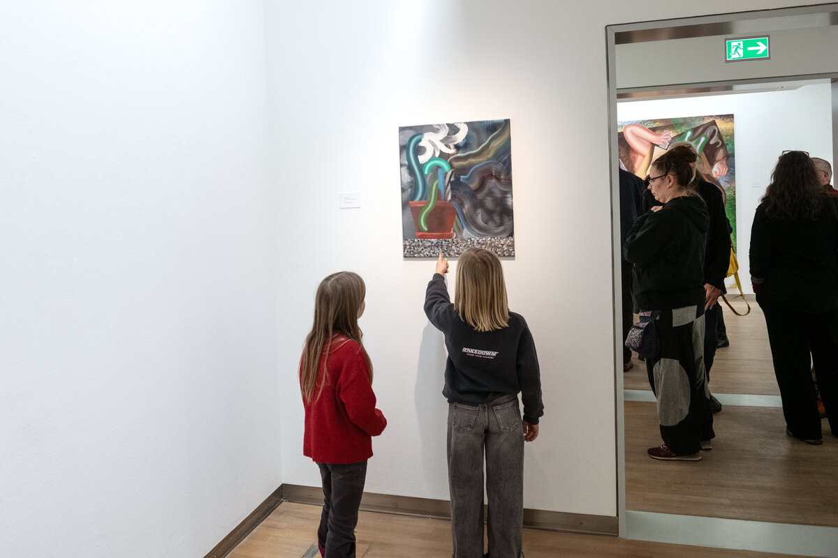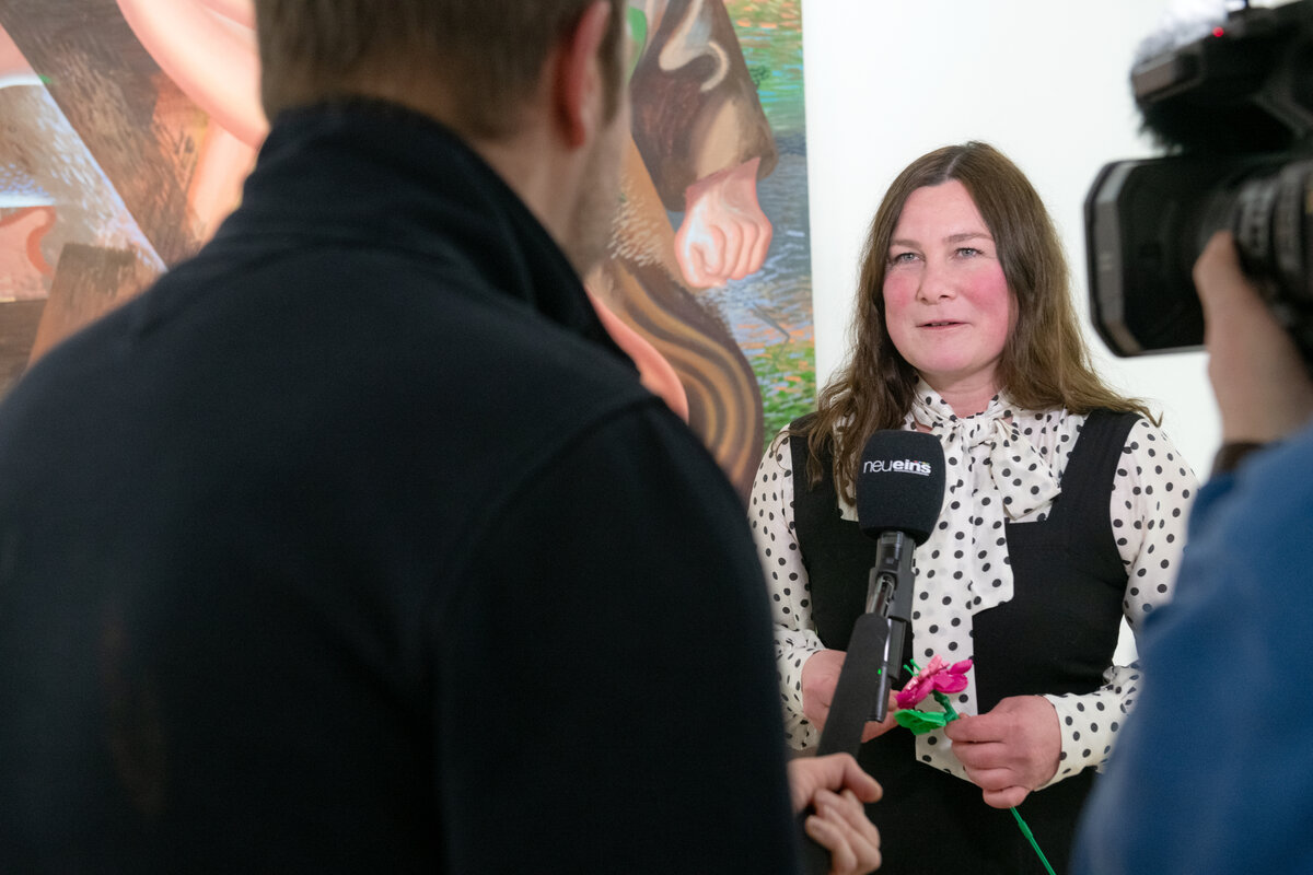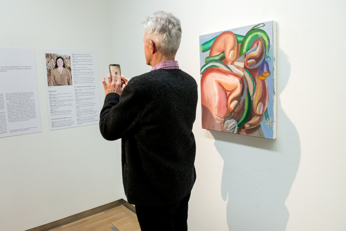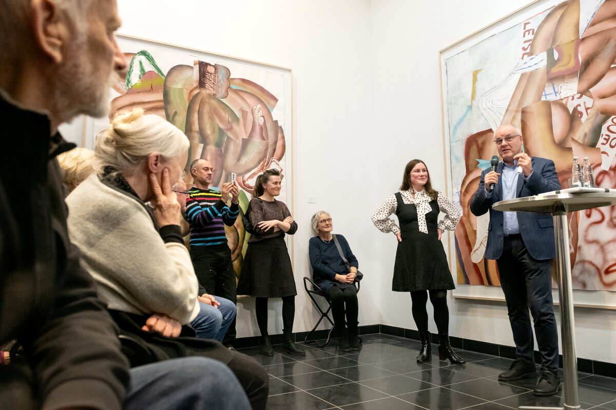 Mit über 100 Gästen startete die Ausstellung „Kristina Schuldt. Tatjana“ am 4. Februar um 17:00 Uhr. Insgesamt 13 großformatigen Gemälde und Collagen stellt die in Neubrandenburg aufgewachsene und heute in Leipzig lebende und arbeitende Künstlerin bis zum 3. Mai 2026 in der Kunstsammlung aus. Die Bilder sind Leihgaben privater Sammlerinnen und Sammler sowie der die Künstlerin vertretenden Galerie EIGEN + ART Leipzig/Berlin, die diese einzigartige Ausstellung ermöglichten.