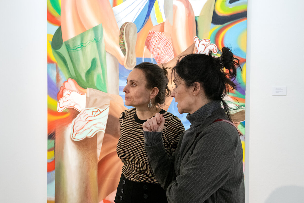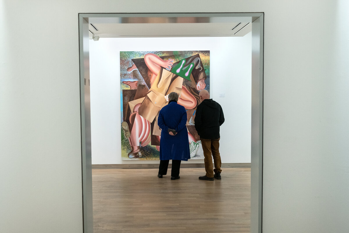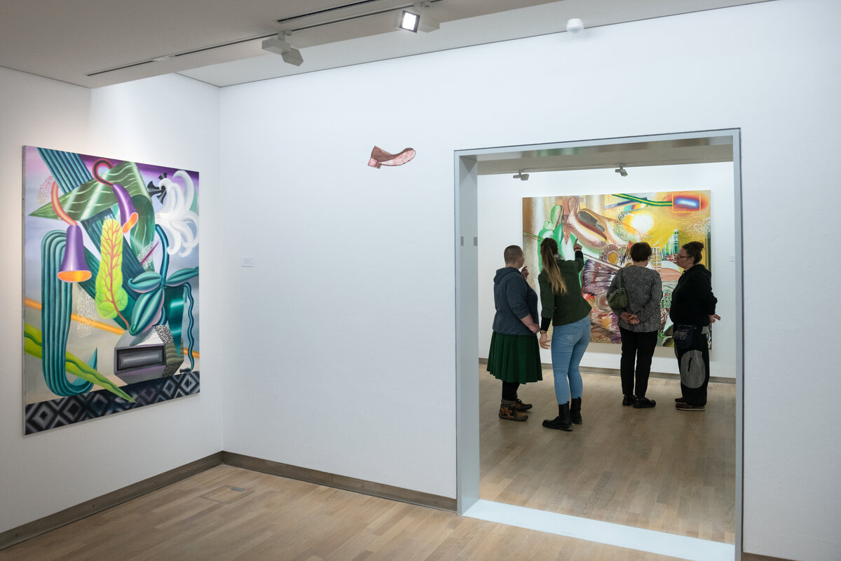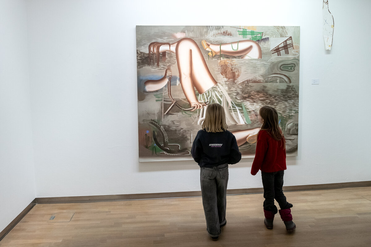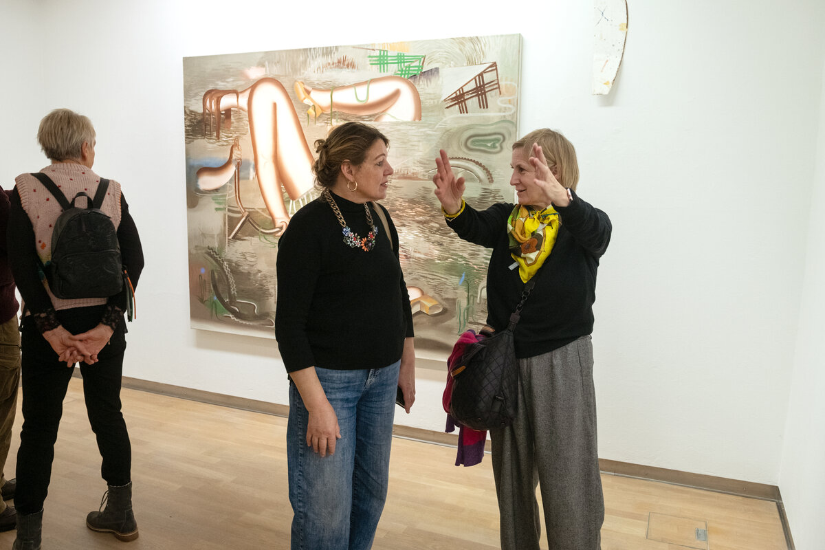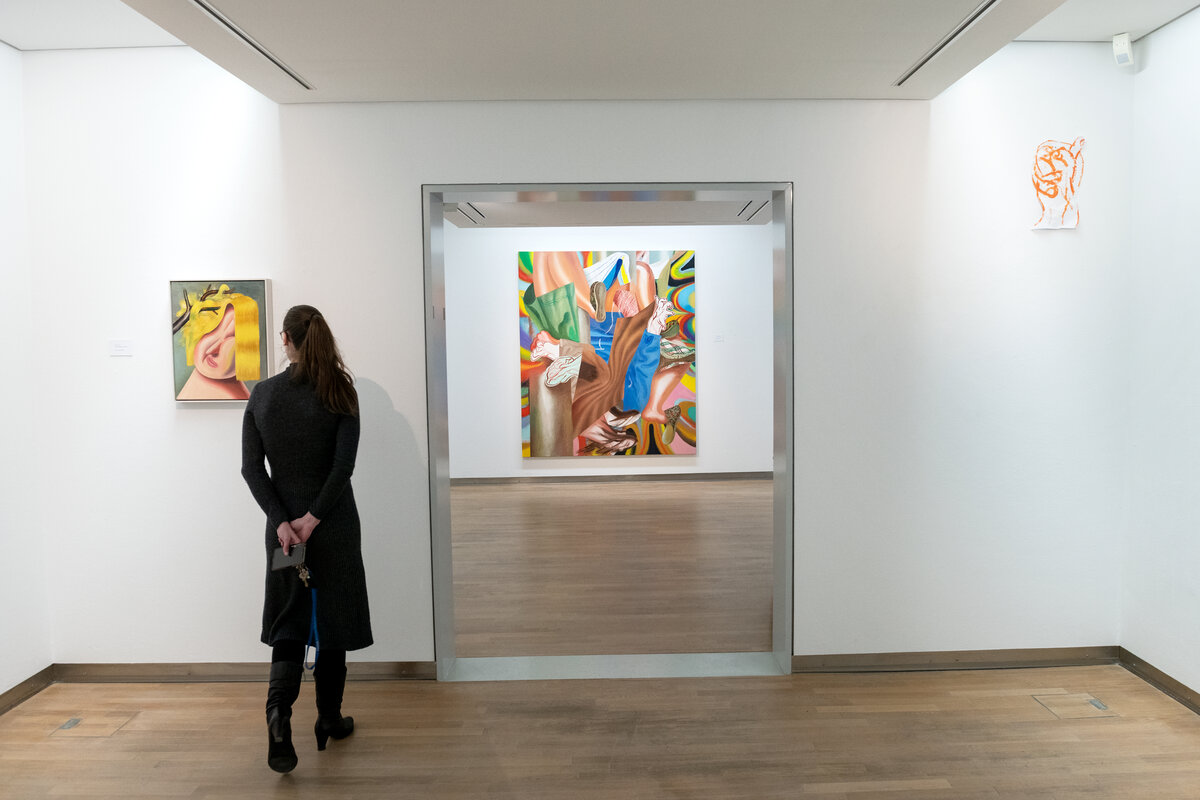 In den farbintensiven Bildern von Kristina Schuldt verschmelzen kunsthistorische und literarische Referenzen mit politischen, feministischen und persönlichen Themen zu rätselhaften, zugleich humorvollen Kompositionen. Ihre Bilder reflektieren die zerstreute Aufmerksamkeit unserer hochvernetzten Gegenwart und vermitteln den Menschen als eine im Bildraum gleichzeitig ein- wie auftauchende Gestalt. Nichts erscheint statisch oder abgeschlossen – eine explosive, dynamische Kraft durchdringt die zum Teil großformatigen Arbeiten und lässt sie nahezu übervoll wirken.